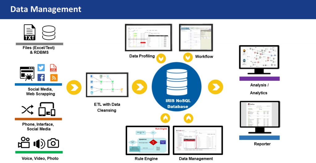 Besides standard files and databases, EliteSys is capable to convert voice and video to text, interface to extract data from external instruments, social media and web crawler through the support of big data features.